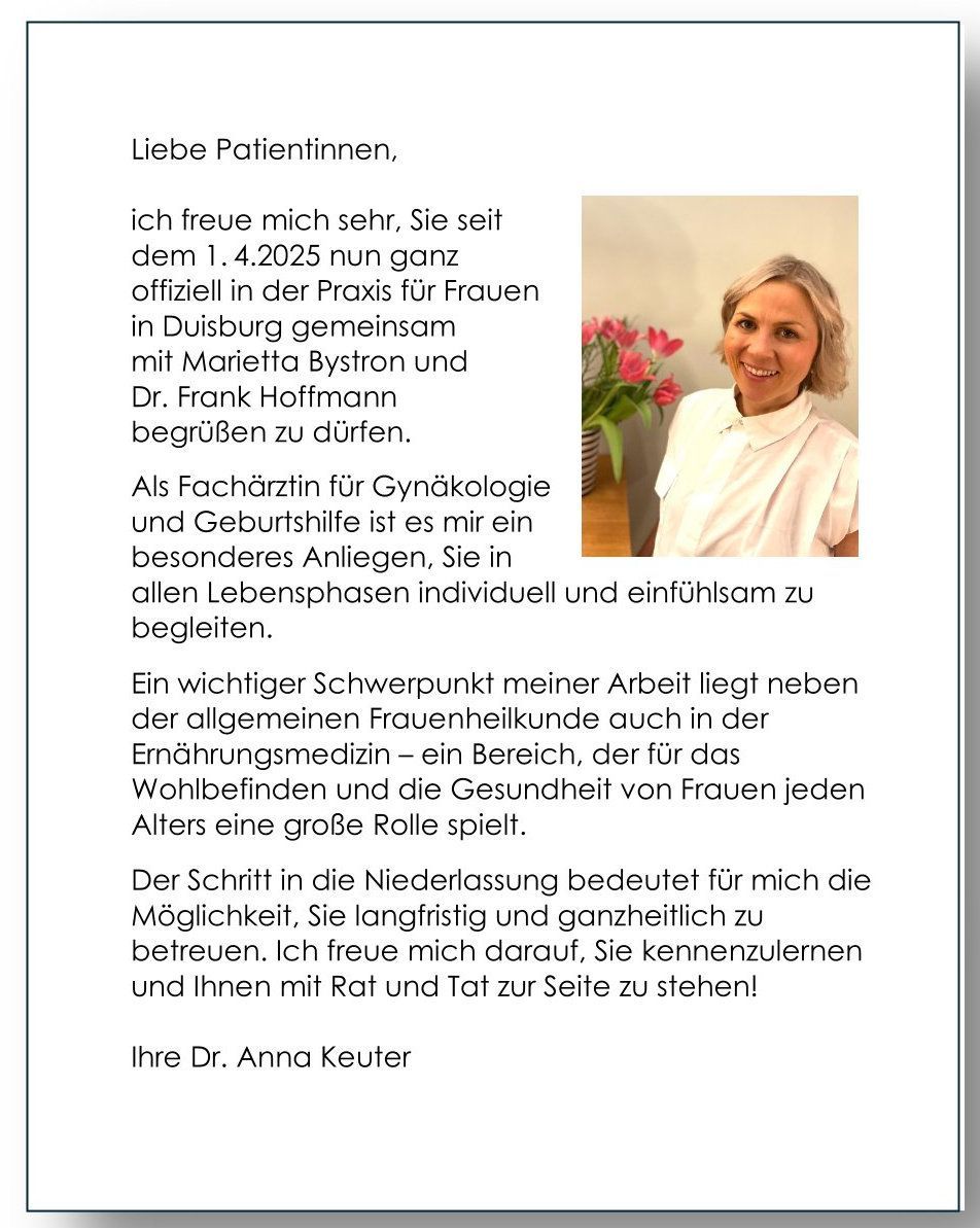 Herzlich willkommen in Ihrer Praxis für Frauen in Duisburg